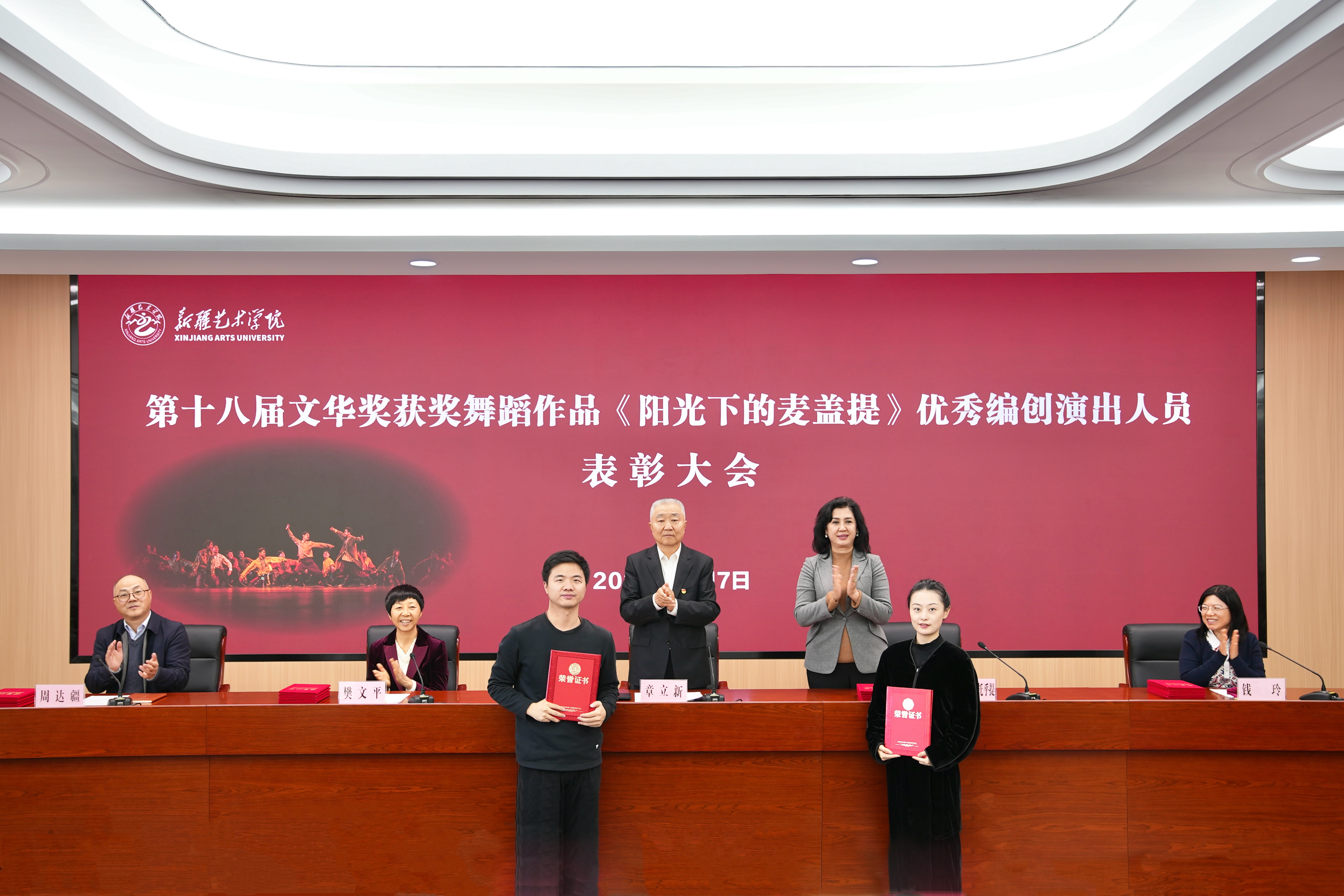会上,学校党委副书记樊文平宣读了新疆艺术学院关于表彰第十八届文华奖获奖舞蹈作品《阳光下的麦盖提》优秀编创演出人员的决定,校领导为编创人员舞蹈学院教授张鹏、李梦雨颁发“文艺创作突出贡献奖”,为22名参演学生颁发“文艺展演优秀表演奖”,两名学生代表作交流发言。