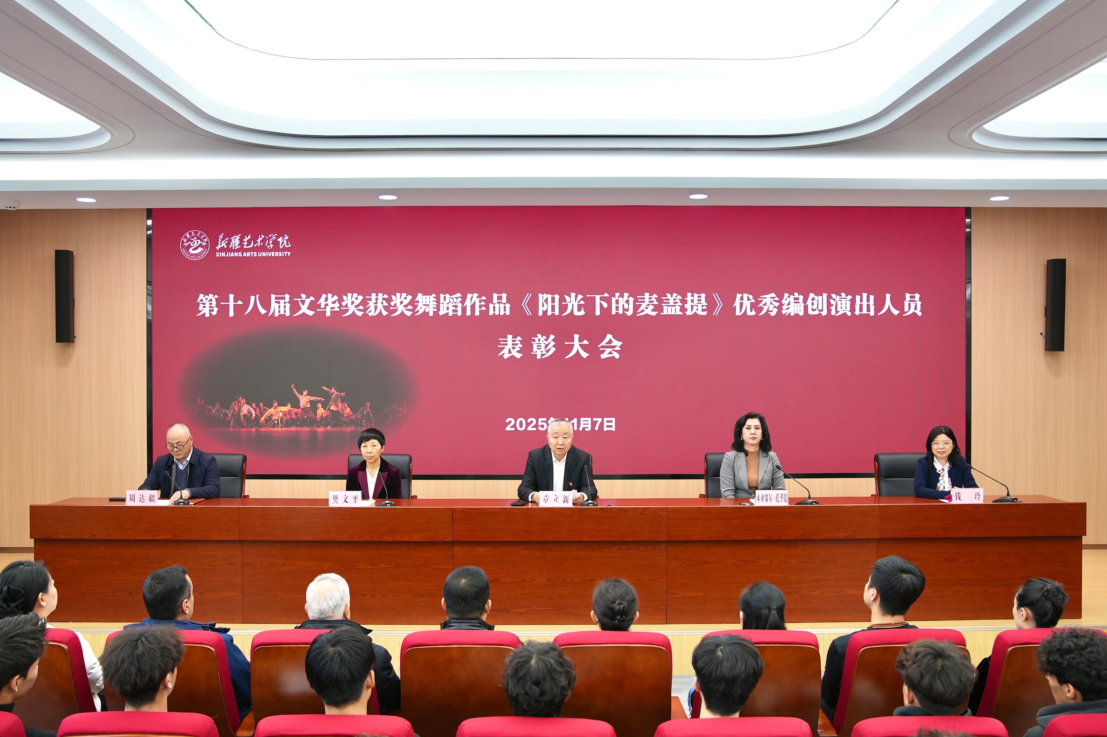 11月7日,新疆艺术学院举行第十八届文华奖获奖舞蹈作品《阳光下的麦盖提》优秀编创演出人员表彰大会。学校党委书记章立新出席并讲话,领导班子成员樊文平、钱玲、周达疆和舞蹈作品编创演出人员、相关单位负责人及舞蹈学院师生代表参加会议。院长木亚赛尔·托乎提主持会议。