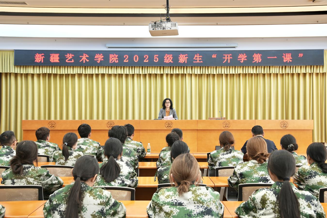 木亚赛尔·托乎提院长介绍了新疆的概况以及新疆社会稳定长治久安和经济社会发展的大好形势,介绍了学校的办学历程和良好的发展态势。她在授课中说,今年是中国人民抗日战争暨世界反法西斯战争胜利80周年,同学们要以史为鉴,在传承弘扬伟大抗战精神中厚植爱国爱疆情怀,铸牢中华民族共同体意识;挺膺担当,在建设美好新疆的火热实践中贡献青春力量;踔厉奋发,在学校内涵建设高质量发展建设中彰显青春风采,争做德艺双馨文艺人才。同时,她提出三点期望:一要牢记“传承创新 德艺双馨”校训,把握好艺术之路是以德奠基、以美引领的树人之路,是精益求精、全面成长的求知之路,是勇担使命、超越自我的奋斗之路的深刻内涵。二要踔厉奋发,脚踏实地。把个人理想与祖国和人民需要紧紧联系在一起,在为祖国繁荣发展服务的进程中实现个人人生理想。三要遵规守纪,成长成才。从严律己,弘扬社会正气,立志成为高素质创新型文艺人才。