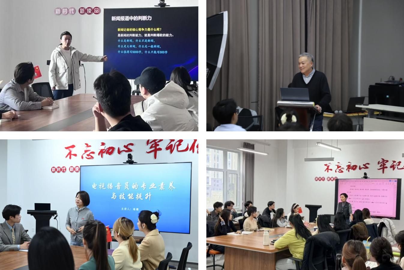 10月29日至11月26日,传媒学院先后邀请新疆广播电视台孙悦、海米提·买买提、杨洁、罗鸣;乌鲁木齐广播电视台海潮、王莉、王鑫、马巍等,围绕电视播音员的专业素养、社会服务类节目主持策略、生活服务类节目场景化表达、编导思维在播音中的运用等举办了系列专题讲座,涵盖播音主持实战技能、人文关怀与角色认知、主持角色定位与融合传播等方面。