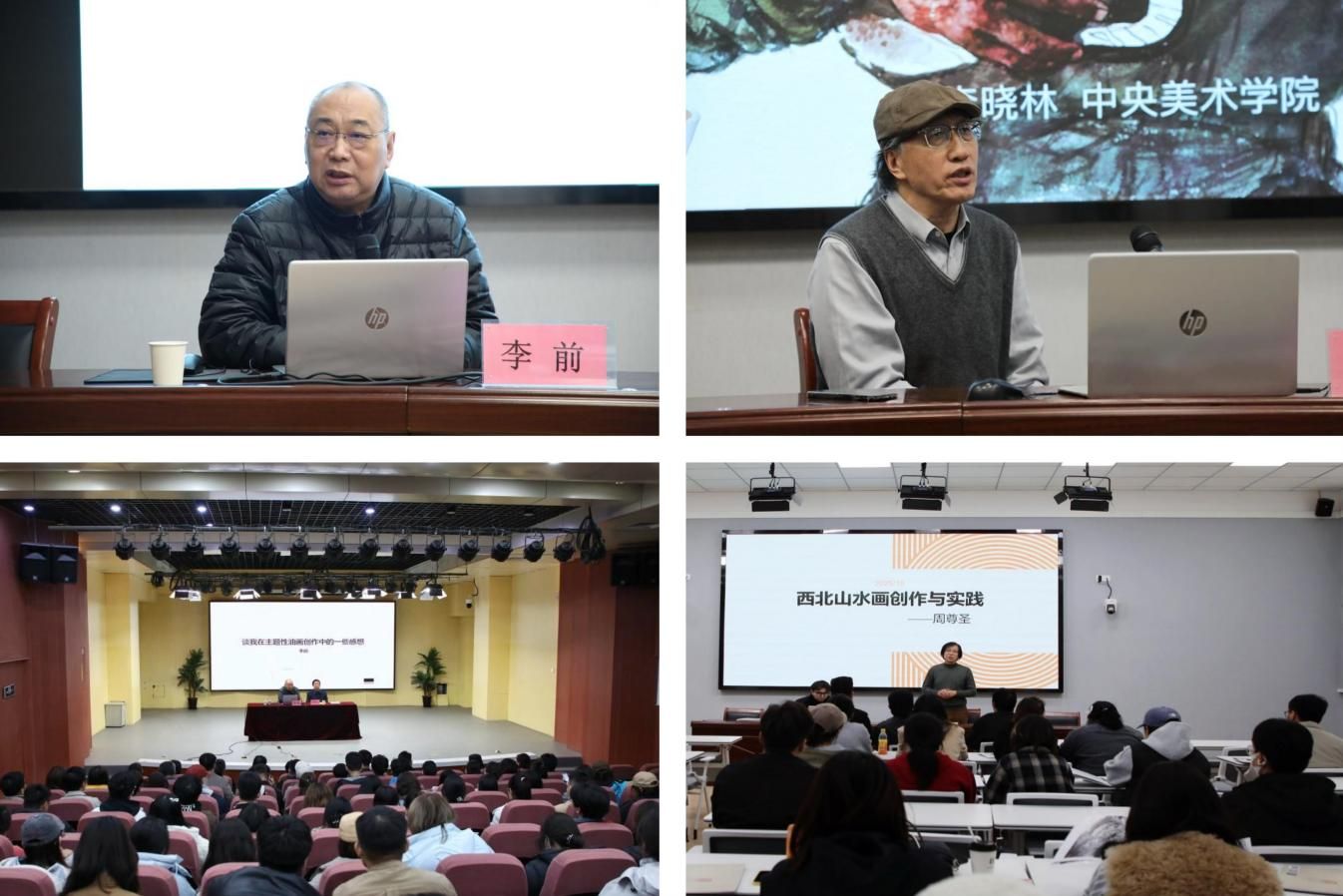 10月28日至11月21日,美术学院先后邀请中央美术学院赵伟和李晓林、上海戏剧学院李前、中国艺术研究院周尊圣,分别作了题为《我怎样画油画——〈工人是“天”〉》《西北山水创作与实践》《谈我在主题性油画创作中的一些感想》《写生与创作——我的绘画实践》《学位论文写作与文献检索》的专题讲座,涵盖主题性油画创作、西北山水创作等方面。