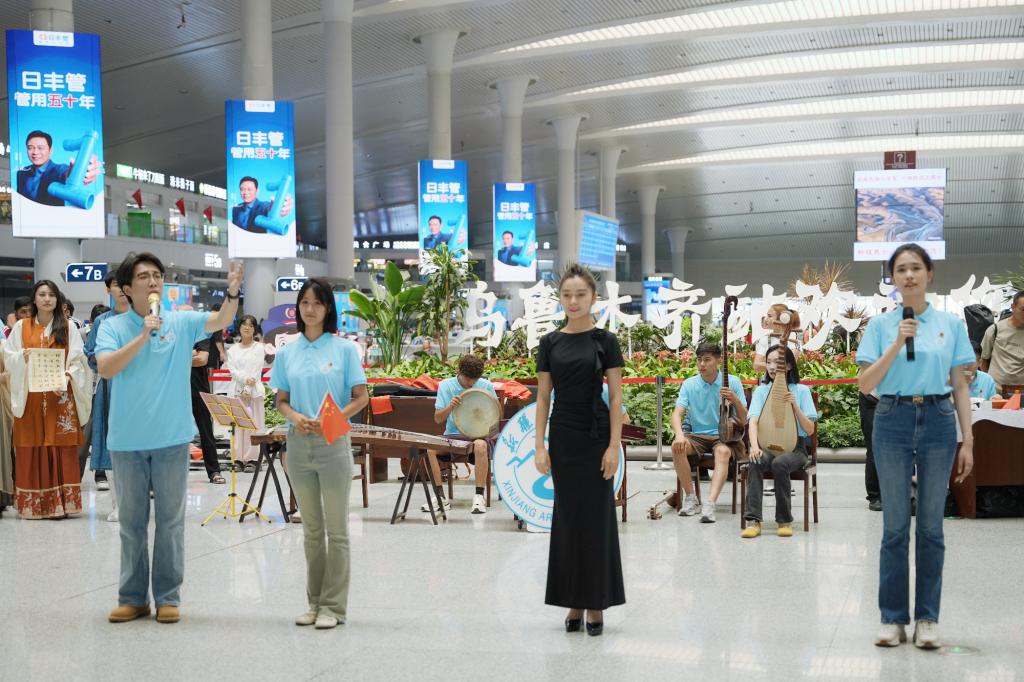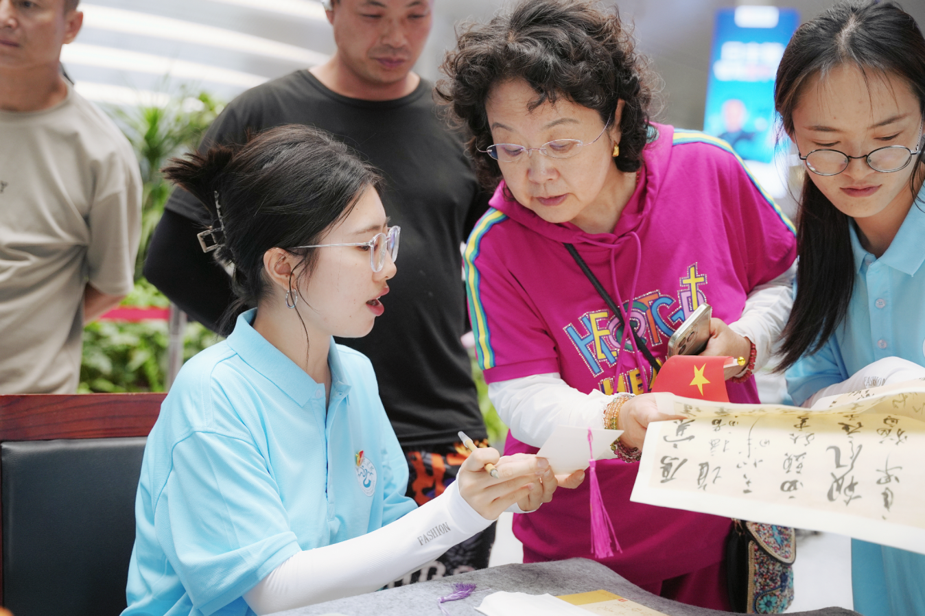 出发前,社会实践服务综合团队成员在乌鲁木齐高铁站进行了文艺表演。歌曲《我和我的祖国》,悠扬的旋律瞬间吸引众多旅客驻足,引发全场深情合唱;《民族舞串烧》与经典民歌《达坂城的姑娘》,欢快的节奏与优美的舞姿将现场气氛推向高潮;汉服走秀,展现了中华传统服饰之美;诗朗诵《祖国啊,我亲爱的祖国》,点燃现场人们的激情......活动现场,社会实践服务综合团队成员挥毫泼墨,为现场旅客和工作人员赠送精美的书法作品,传递美好祝福。